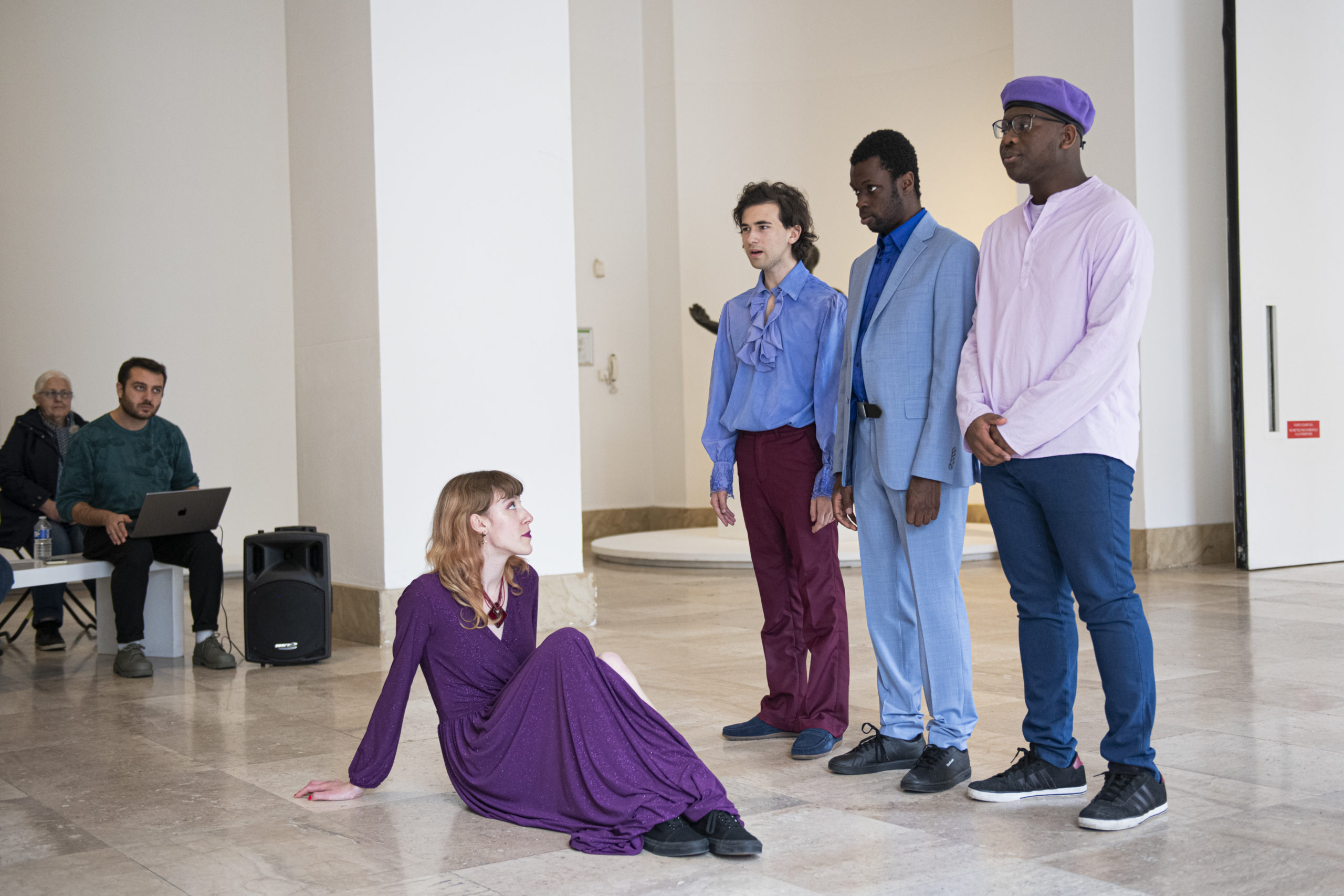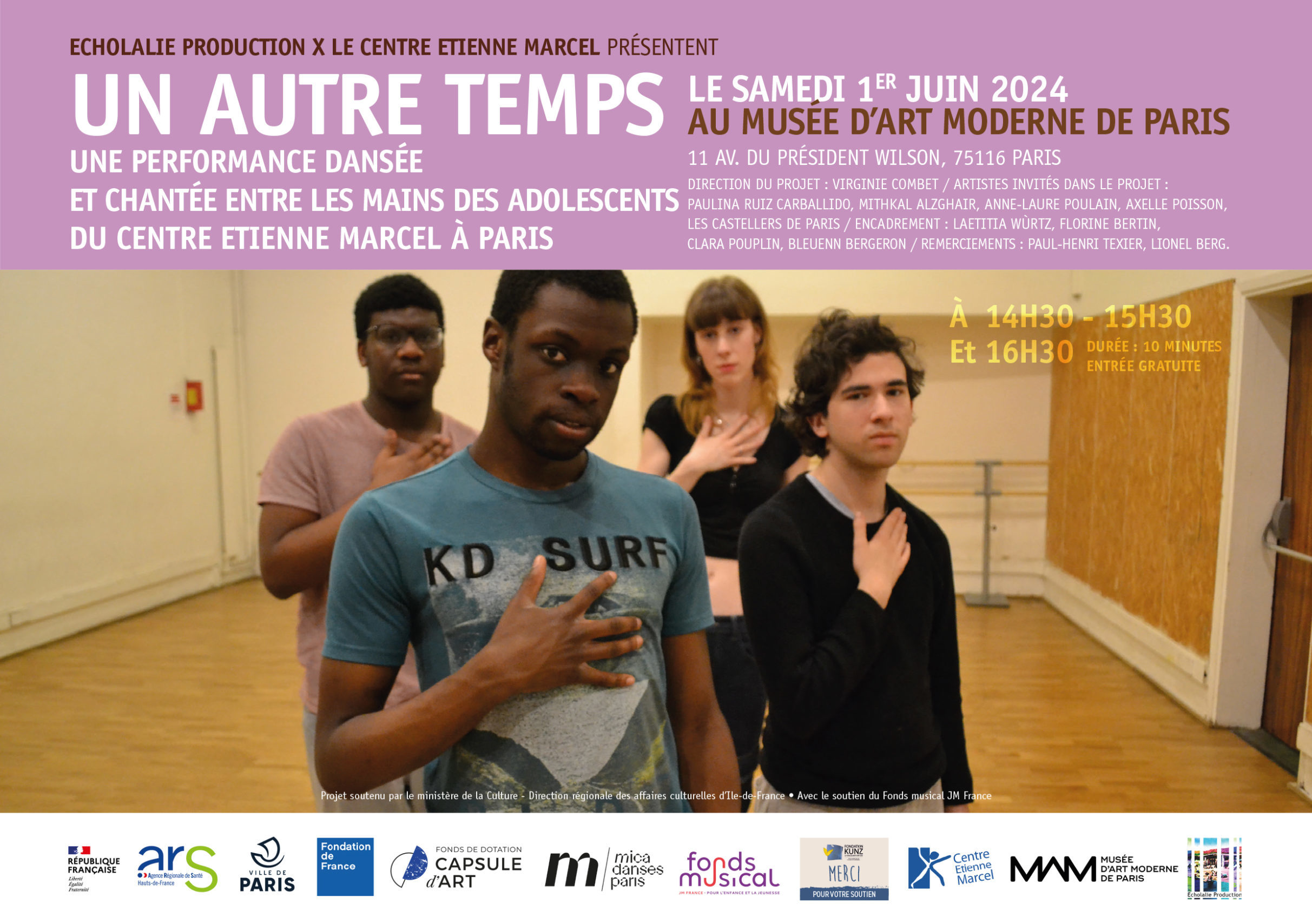 La pièce dansée et chantée, « Un autre temps » a été créée à partir des tableaux de Robert Delaunay Rythme n° 1 et Rythme n°2. Les adolescents se sont inspirés des oeuvres du Musée d’Art Moderne de Paris et ont travaillé autour des couleurs. Cette réflexion est transcrite dans une création de costumes misant sur l’agencement des couleurs violette et bleue. Ils et elle se sont questionnés sur l’avenir sensible et incertain. Le propos de leur performance ? Un groupe de jeunes est renvoyé sur la planète après une catastrophe écologique afin de s’assurer que cette Terre est à nouveau viable.